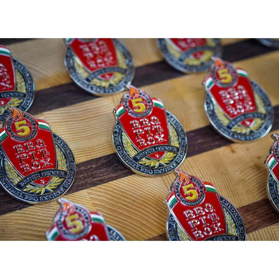 Egyedileg tervezett és gyártott fémkitűző, a BBQ Pit Box márka ötéves jubileuma alkalmából. Mérete: 42 x 56 mm.
