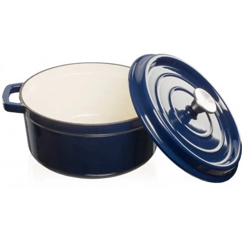 Zománcozott öntöttvas edény, belül matt, kívül fényes. Széles fogantyúkkal ellátott.