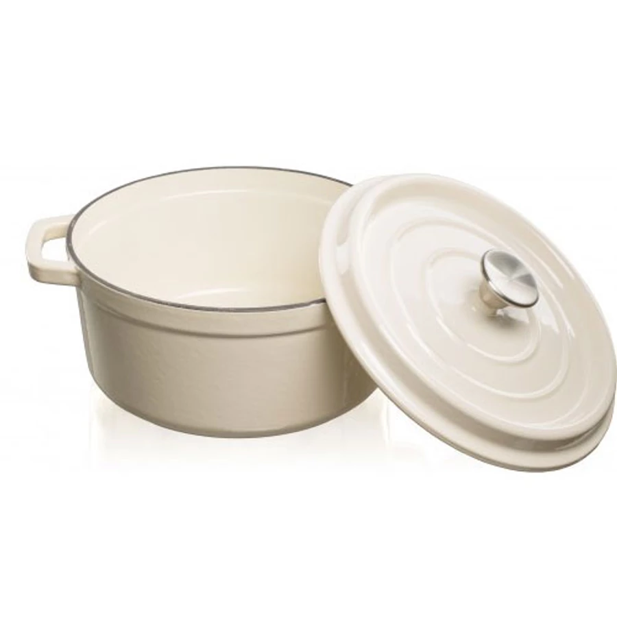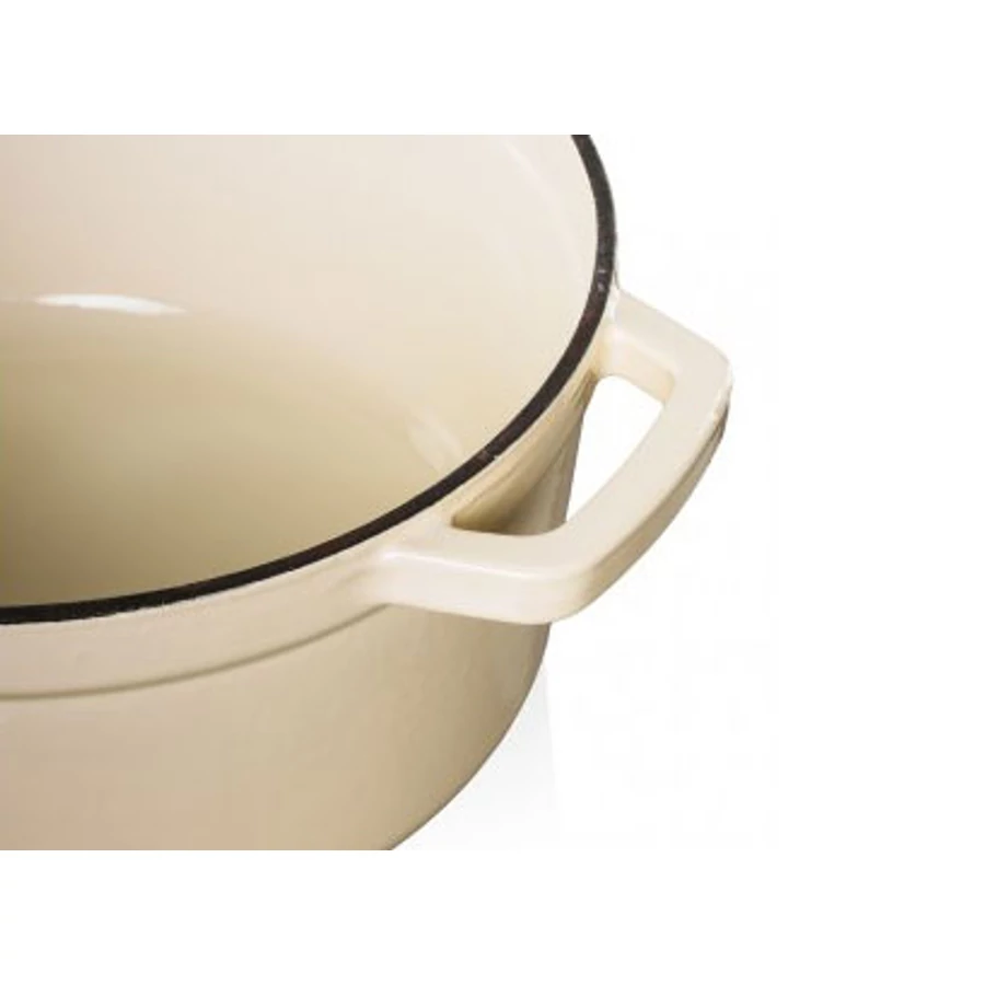 Zománcozott öntöttvas edény, belül matt, kívül fényes. Széles fogantyúkkal ellátott.