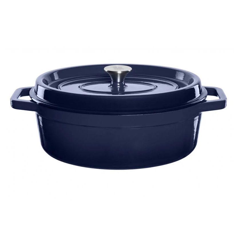 Zománcozott öntöttvas edény, belül matt, kívül fényes. Széles fogantyúkkal ellátott. Ovális formájú.