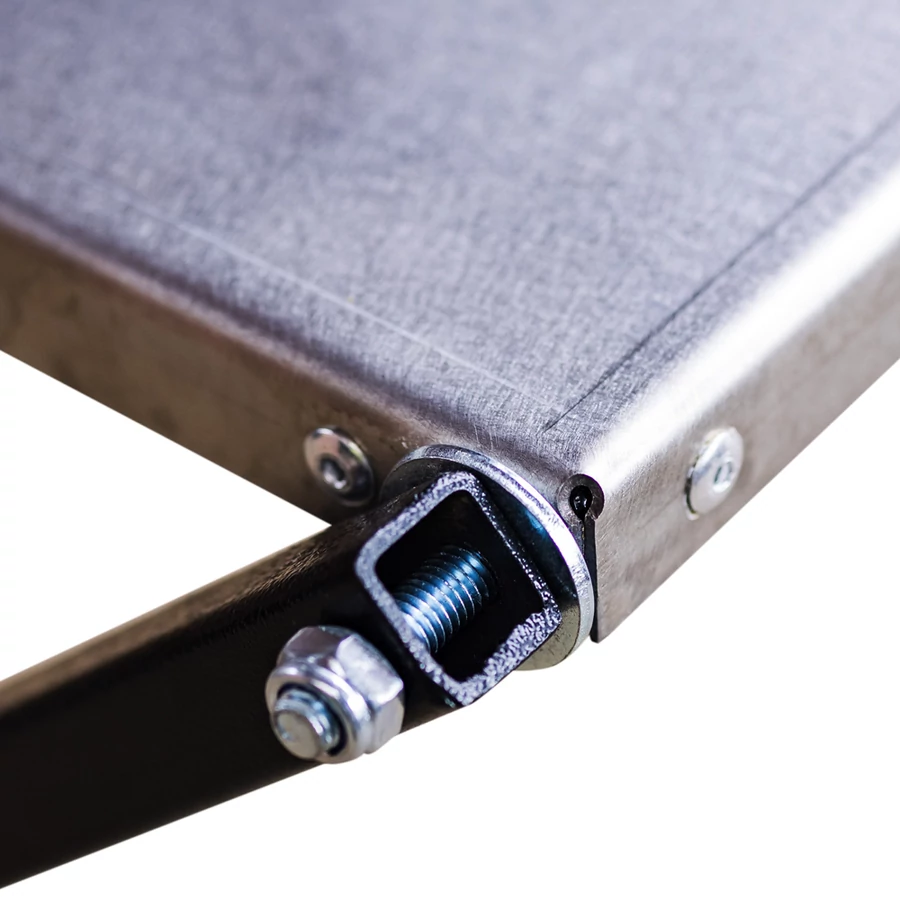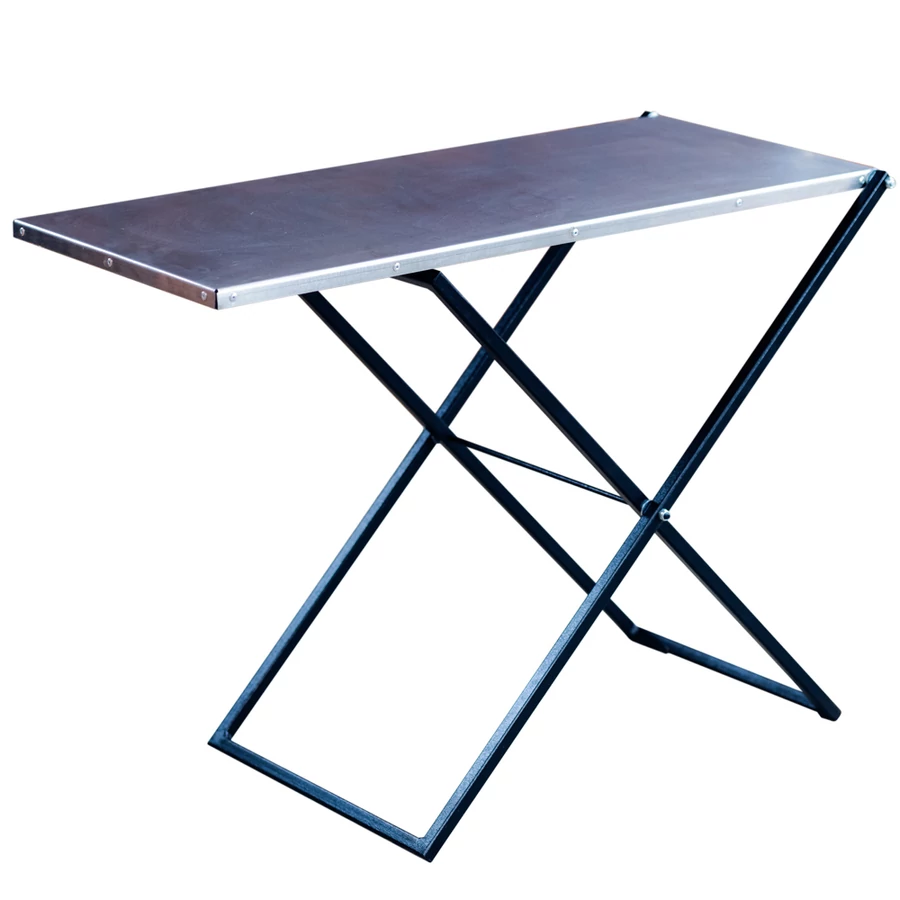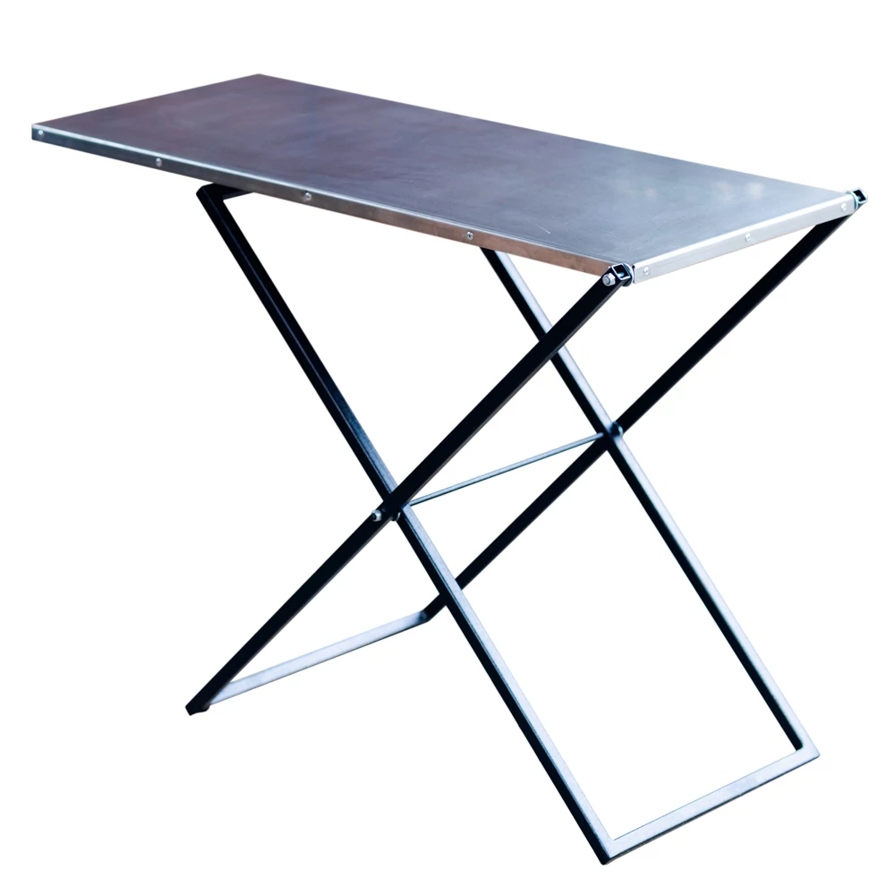 Összecsukható, állítható magasságú asztal, rozsdamentes munkalappal.