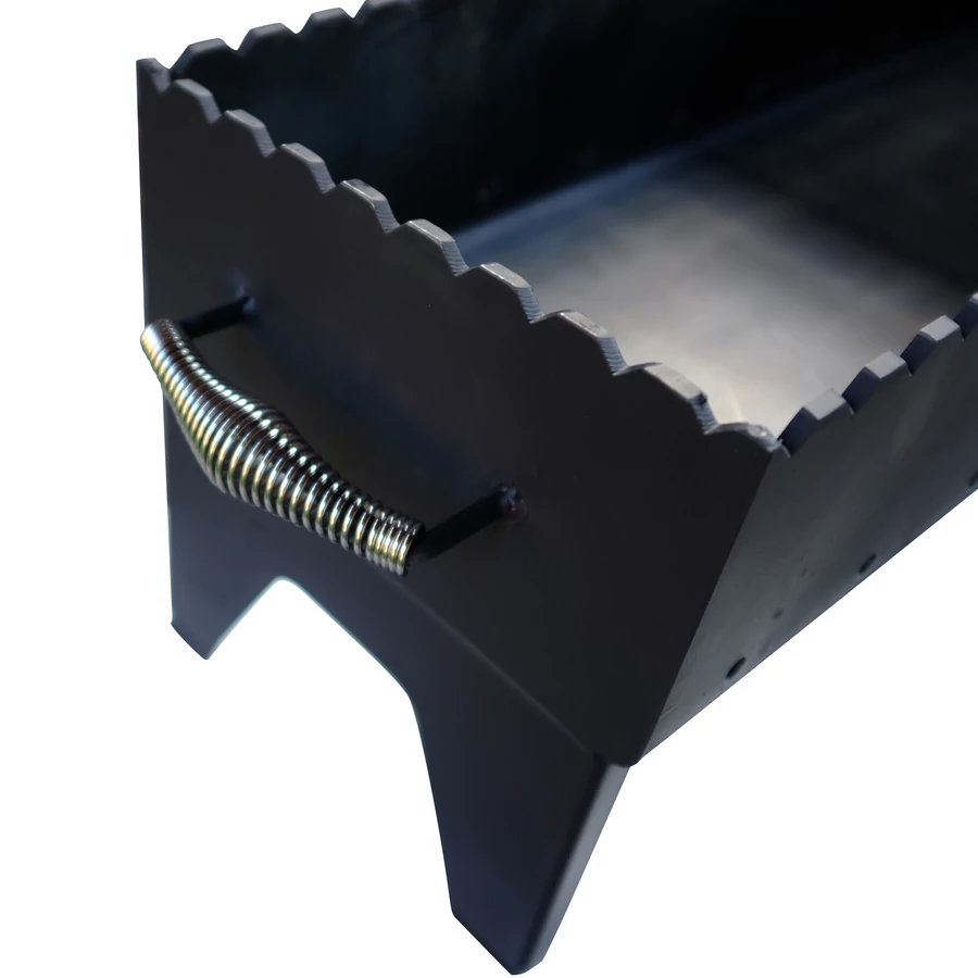A vályú oldalsó része is fogazott, így lehetővé téve hosszabb nyársak keresztben történő felfektetését.