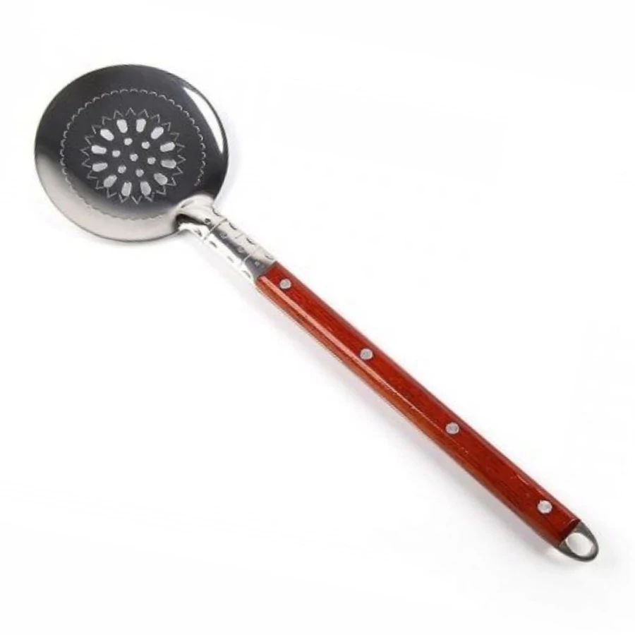 Rozsdamentes keverőkanál/ lapát piláf-készítéshez, qozon-edényben történő főzésekhez. Fanyelű, mintázott.