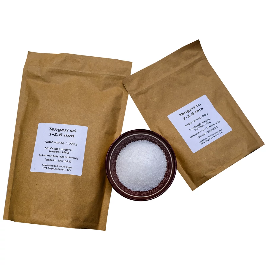 Kiváló minőségű tengeri só, 1.0-1.6 mm-es szemcsékkel, amely ideális a BBQ-húsok fűszerezéséhez.